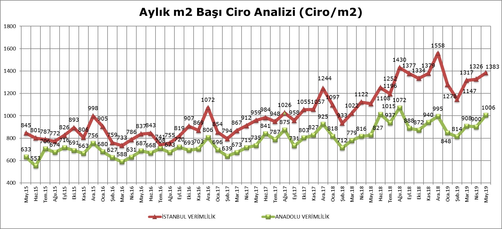 AVM’lerde kiralanabilir alan (m2) başına düşen cirolar Mayıs 2019’da İstanbul’da 1.383 TL, Anadolu’da 1.006 TL olurken Türkiye geneli m2 verimliliği ise Mayıs 2019’de 1.157 TL olarak gerçekleşti.