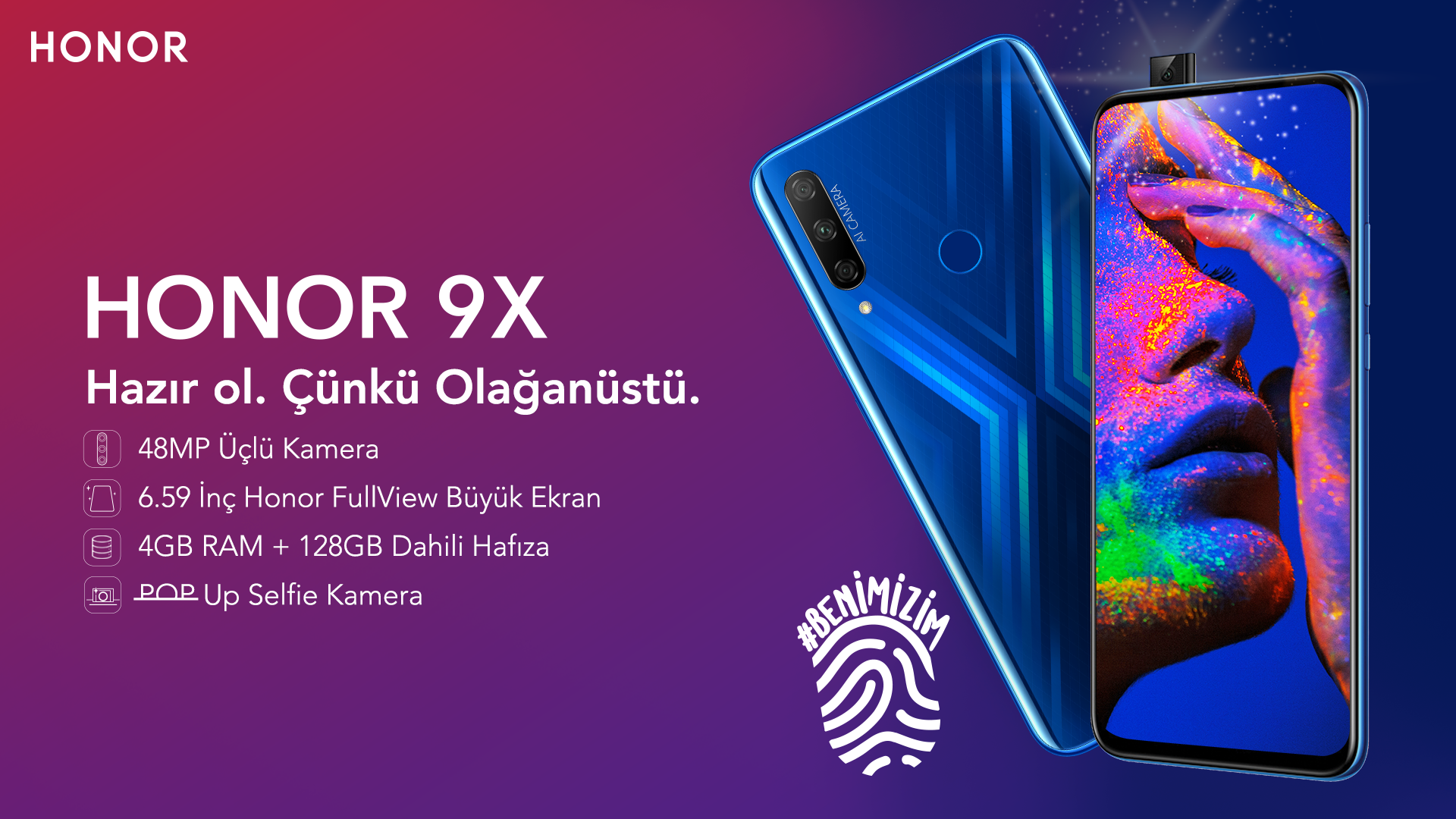 HUAWEI Technologies çatısı altında gençlere yönelik teknolojik ürünleriyle değer yaratan HONOR, yeni modeli HONOR 9X’i İstanbul’da düzenlediği bir etkinlikte tanıttı. Son dönemde yaptığı sürpriz kampanyalarla adından sıklıkla söz ettiren HONOR, yenilikçi ve sıra dışı tarza sahip yeni modeli 9X ile yurtdışında elde ettiği başarılı çıkıştan sonra şimdi de Türk kullanıcıların karşısına çıkmaya hazır. Pop-up kamerası ile geniş ekran avantajı, dikkat çekici tasarımıyla farklı bir tarz ve uzun pil ömrüyle işlevselliği bir arada sunan 9X gençlerin yeni favorisi olmaya aday.