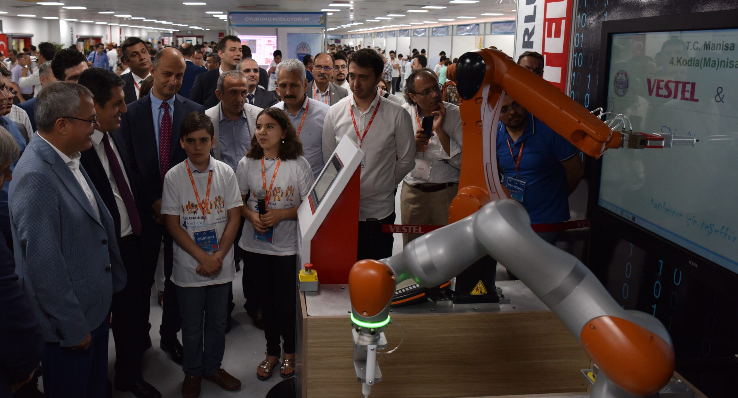 Vestel City’nin yeni Çamaşır ve Kurutma Makinası Fabrikası alanında kurulan 47 stantta öğrenciler, kodlama eğitimleri sayesinde ortaya çıkardıkları robot teknolojileri, uygulama yazılımları ve 3D yazılımlarını ziyaretçilere sundu. Stantlarda Vestel robotları sergilenerek kodlama ve robot teknolojilerinin üretimdeki özellikleri sergilendi. Dört öğrenci kodladıkları Vestel robotuyla özel bir gösteri yaptı. Hazırladıkları yazılımlarla akıllı tahta üzerine robot yardımıyla yazı yazdıran öğrenciler ayrıca, farklı bir robota da el ile yörünge takibi yaptırarak bu oyunu gelen misafirlere oynattılar. Oyunun sonunda yörüngeyi doğru takip edilen çocuklara hediye verildi. Ayrıca Vestel çamaşır ve bulaşık makineleri için program yazılımını geliştiren öğrenciler makinelere komutlar vererek ürüne ayrı ayrı işlemler yaptırdılar. Yine öğrenciler Vestel’in kokuları birbirine karıştırmayan beş tepsili fırınında hem kek pişirdiler hem de fırını yeni kodlarla geliştirdiler.