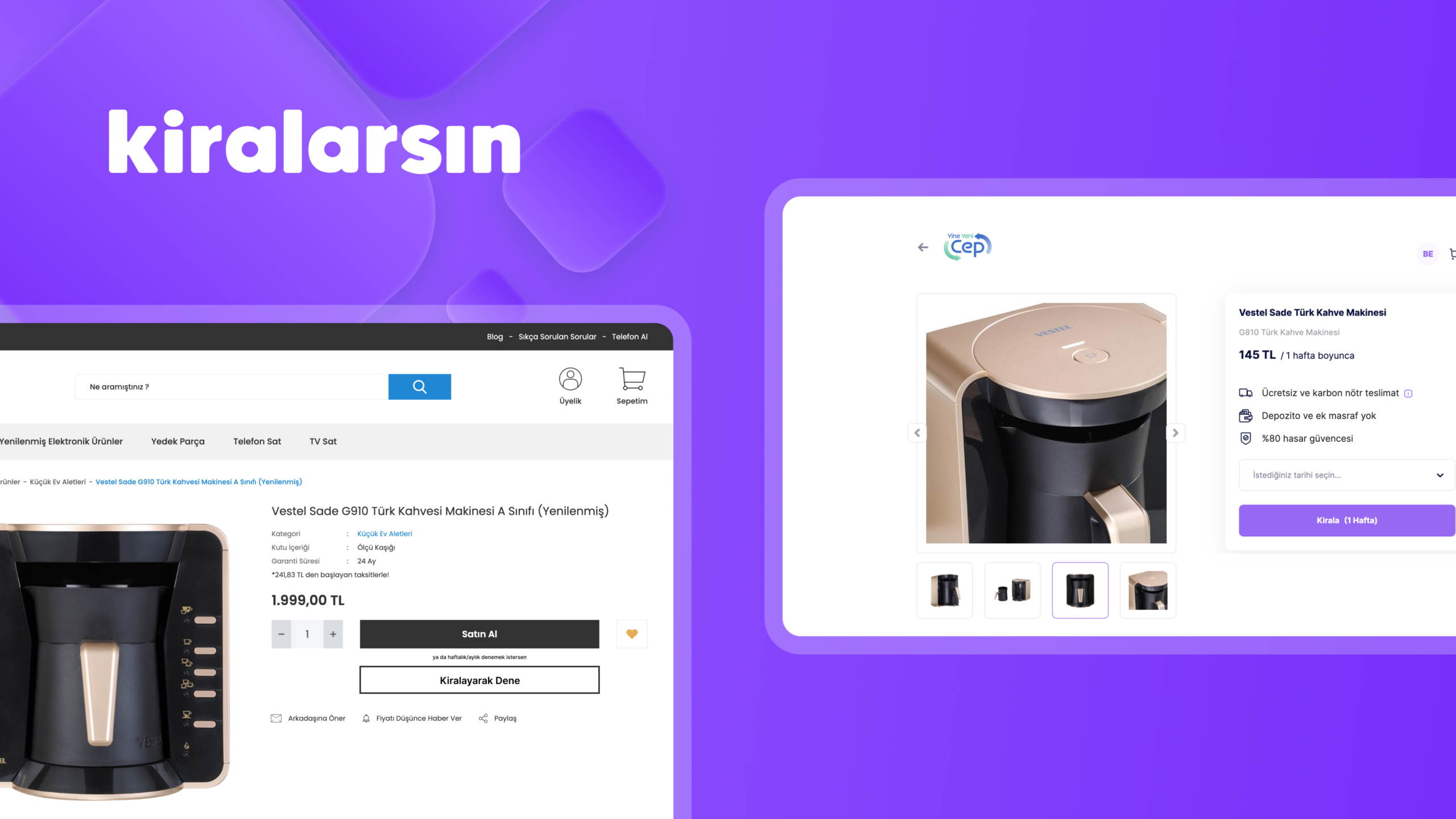 Vestel Ventures çözüm ortaklığı ile, Bakanlık ve TSE onaylı yenileme yetki belgesine sahip Vestel’in yenileme merkezinde yenilenen Yine Yeni Cep platformundaki robot süpürge, televizyon, akıllı saat, akıllı uyku ışığı gibi pek çok cihazı kullanıcılar satın almanın yanı sıra kirlama seçeneği ile tüketicilere sunuluyor. Tüketiciler, www.yineyenicep.com üzerinden ‘Kiralayarak Dene’ butonuna basarak, Kiralarsın altyapısı ve operasyon yönetimi ile farklı kategorilerdeki elektronik cihazları kiralayabiliyor. Böylece kullanıcılar, yenilenmiş elektronik cihazları hem dönemsel ihtiyaçlarını gidermek hem de satın alma karar süreçlerinde denemek için kiralama çözümlerini tercih edebiliyor.