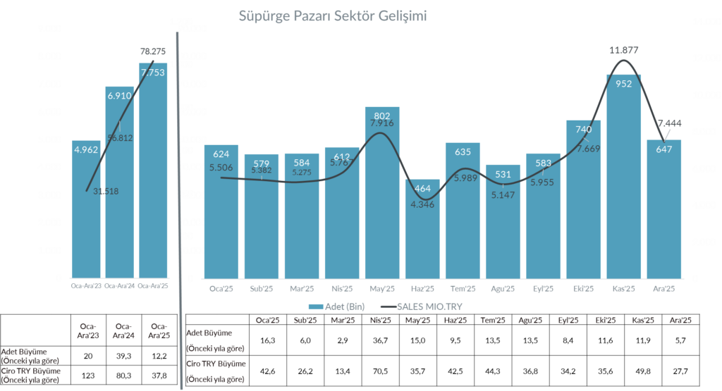 Süpürge pazarı, 2025 yılı boyunca hem adet hem de ciro tarafında büyümesini sürdürmüştür. Yıl genelinde satış adetleri 7,75 milyon adede ulaşarak bir önceki yıla göre %12,2 oranında yükselmiştir. Ciro tarafında ise büyüme çok daha belirgin gerçekleşmiş, toplam pazar hacmi 78,3 milyar TL’ye ulaşarak %37,8 artış göstermiştir. 2025 yılında fiyat artışları, premium segment ürünlere yönelim ve yenilikçi ürün lansmanlarının etkisiyle süpürge pazarı güçlü bir büyüme sergilemiştir.