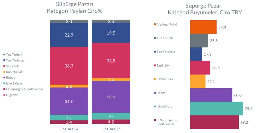 2025 yılında pazara en güçlü katkıyı sağlayan segment Islak & Kuru süpürgeler olmuştur. Bu segmentte satış adetleri bir önceki yıla göre %52 oranında artarken, ciro tarafında büyüme %75 seviyesine ulaşmıştır. Çok fonksiyonlu kullanım, su haznesi ile hem ıslak&kuru süpürme hem de silme imkânı ve tüketicilerin hızlı temizlik beklentisi bu segmenti yılın yıldızı haline getirmiştir.