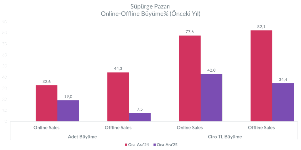 2025 yılı süpürge pazarında hem online hem de offline kanalda büyüme devam etmiş olsa da, her iki kanalın büyüme hızının 2024’e kıyasla belirgin şekilde yavaşladığı görülmektedir. Online kanalda adet büyümesi 2024’te %32,6 iken 2025’te %19 seviyesine gerilemiştir. Benzer şekilde offline kanalın adet büyümesi de %44,3’ten %7,5’e düşmüştür. Her ne kadar iki kanalda da büyüme gerilese de Online kanal Offline kanala göre daha yüksek bir büyüme momentumu taşımaktadır.