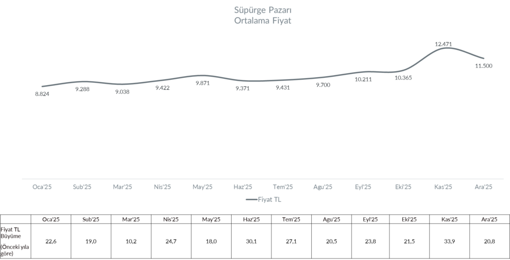 2025 yılı süpürge pazarında ortalama fiyatlar yıl boyunca yukarı yönlü bir seyir izlemiş ve özellikle yılın ikinci yarısında belirgin bir artış göstermiştir. Ocak ayında 8.824 TL seviyesinde olan ortalama fiyat, yıl içinde kademeli olarak yükselerek Eylül’de 10.211 TL, Ekim’de ise 10.365 TL seviyesine ulaşmıştır. Bu artış trendinin en çarpıcı noktası Kasım ayında yaşanmış; Black Friday etkisi ve premium segmentlerdeki artışla fiyatlar 12.471 TL seviyesine çıkarak yılın zirvesine ulaşmıştır. Aralık ayında ise fiyatlar bir miktar gerileyerek 11.500 TL seviyesinde dengelenmiştir.